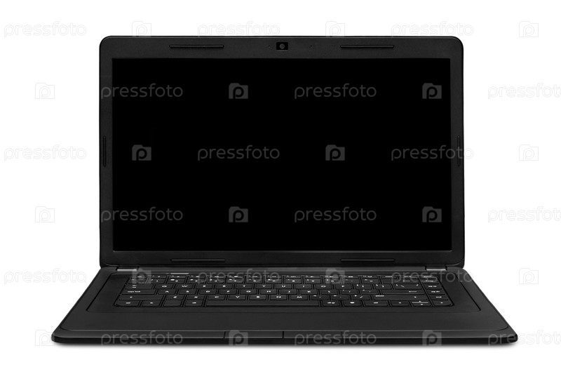 Открытый ноутбук с черным экраном на белом фоне. Передний план