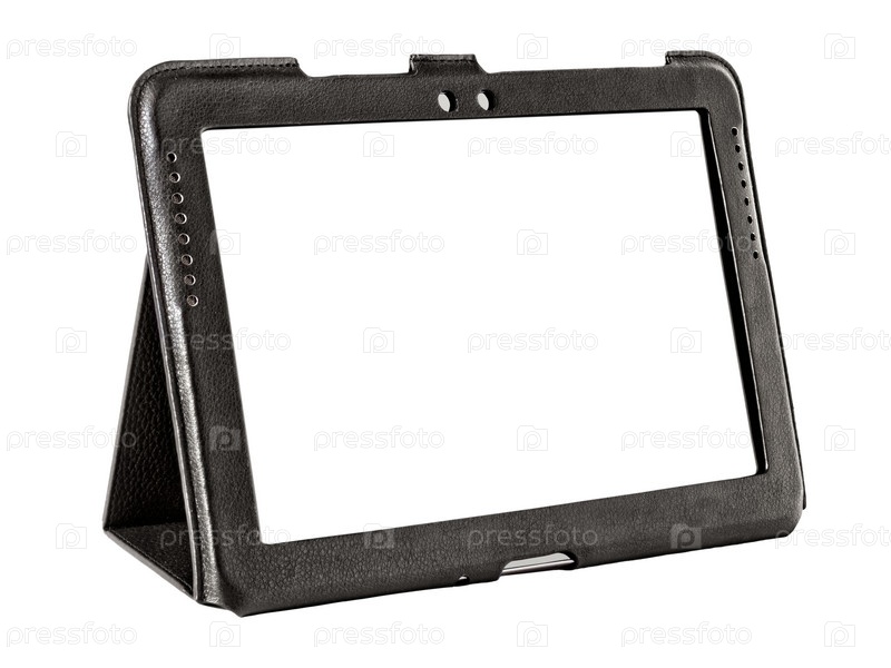Планшет в кожаном чехле на белом фоне