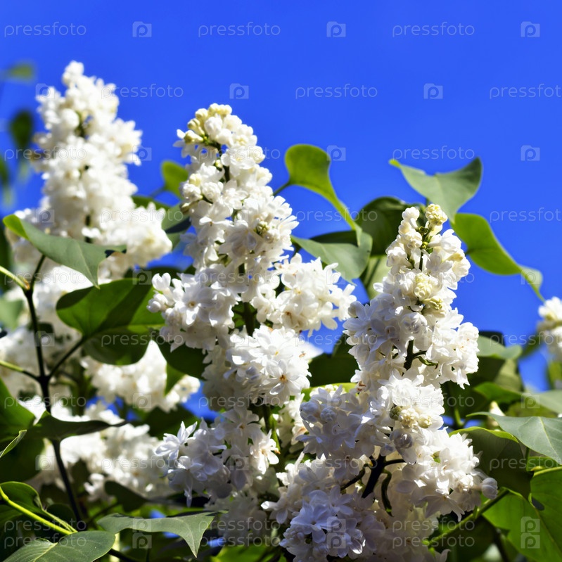 Ветки с цветами белой сирени на фоне голубого неба