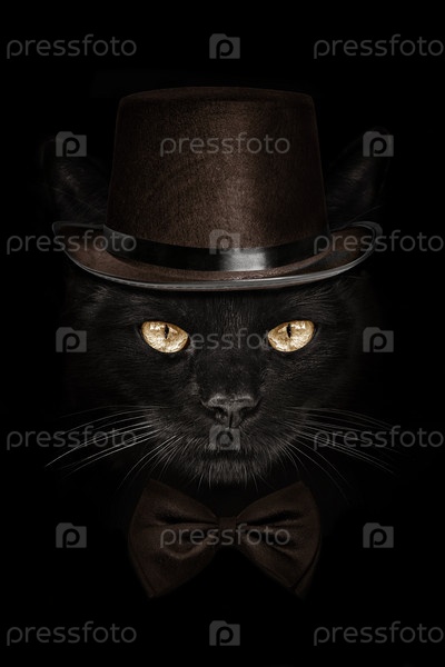 Темная морда кота в коричневой шляпе и галстуке-бабочке