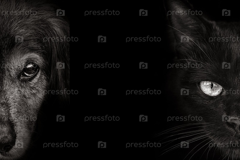 Темная морда спаниеля собака и кошка крупным планом. передний план