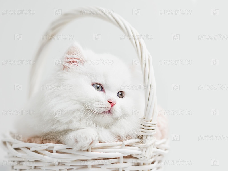 Белый пушистый котенок в плетеной корзине крупным планом