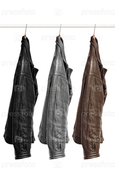 На вешалке висят три кожаные куртки разных цветов. Изолированные на белом фоне