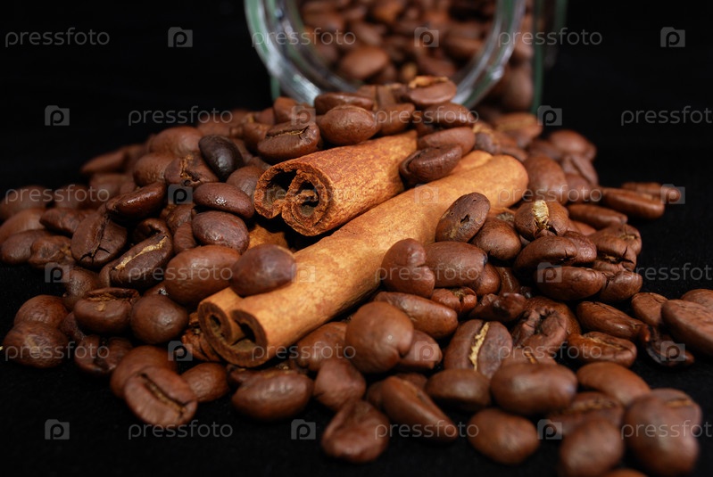 Жареные кофейные зерна и палочки корицы на черном фоне