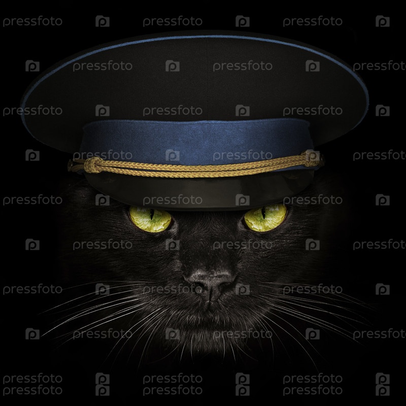 Темная морда черный кот в военной фуражке крупным планом