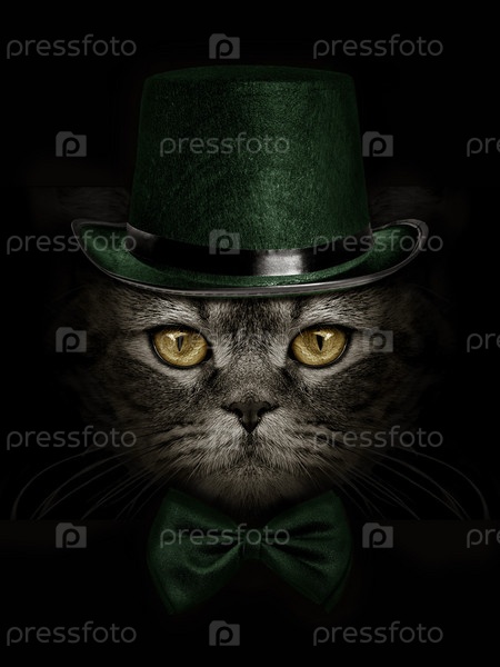 Кот с темной мордой в зеленой шляпе и галстуке-бабочке