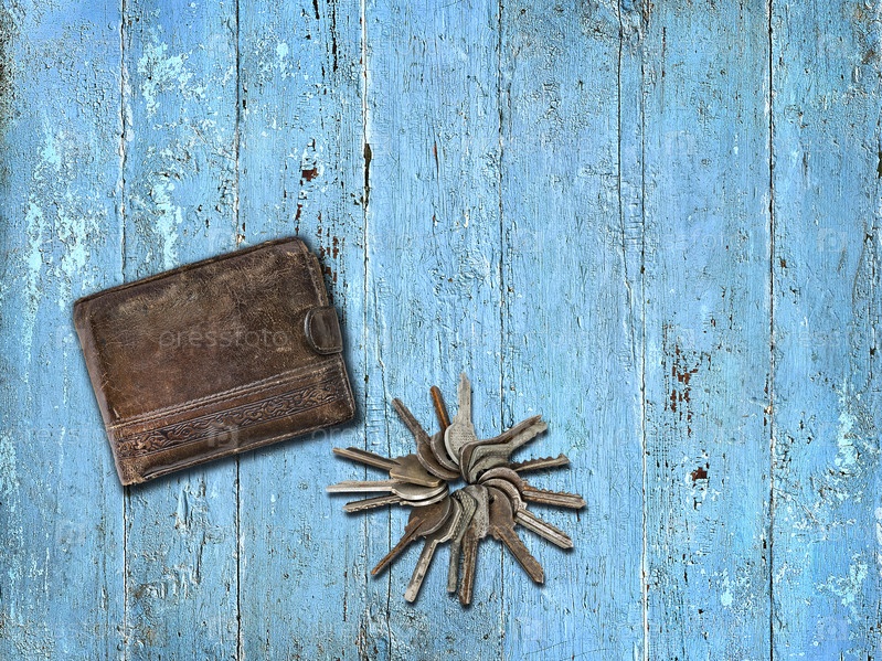 Кошелек и связка ключей на синем деревянном фоне