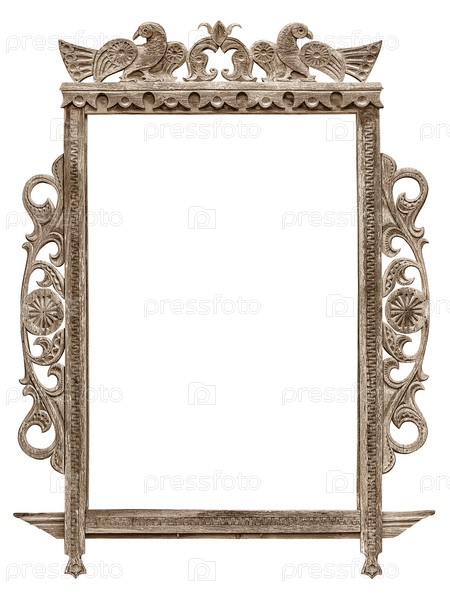 Старинная деревянная резная оконная рама на белом фоне