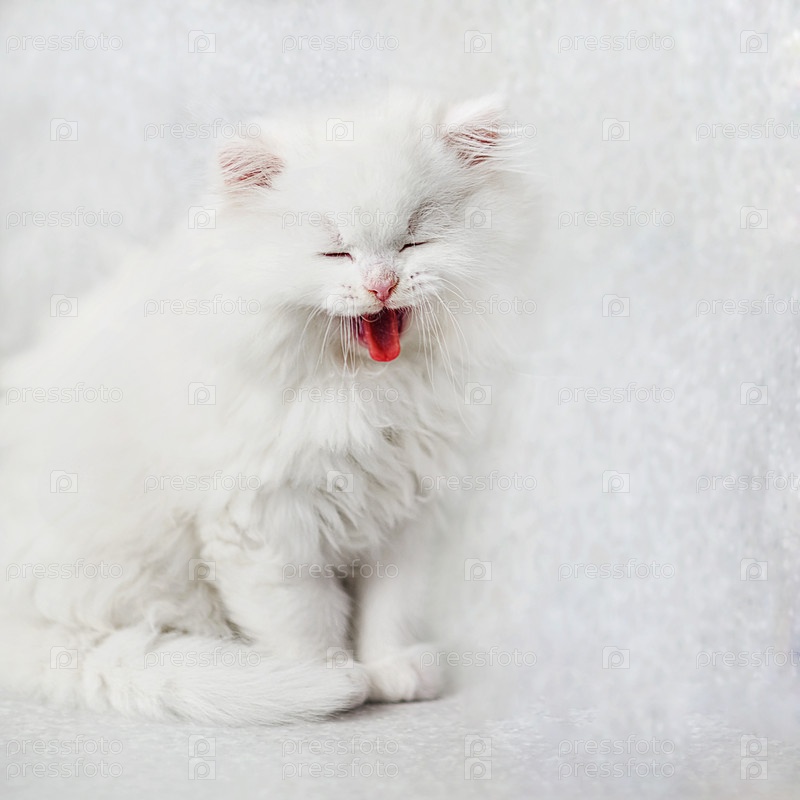 Сидящий улыбающийся белый пушистый котенок на светлом фоне