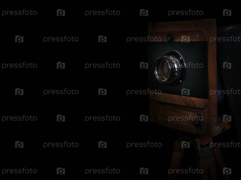 Старая деревянная камера на штативе на черном фоне