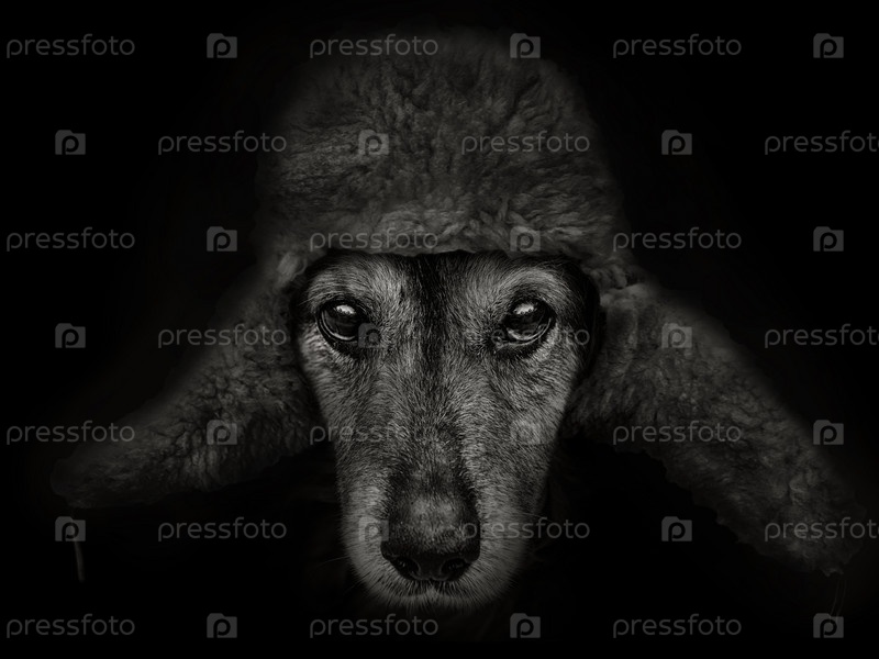 Морда собаки породы спаниель в шапке-ушанке