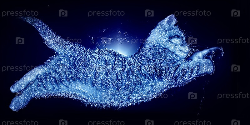 Прыгает мокрый голубой котенок на черном фоне