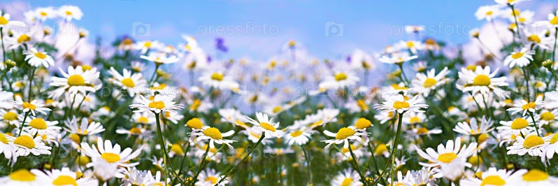 Белые ромашки на голубом небе с облаками