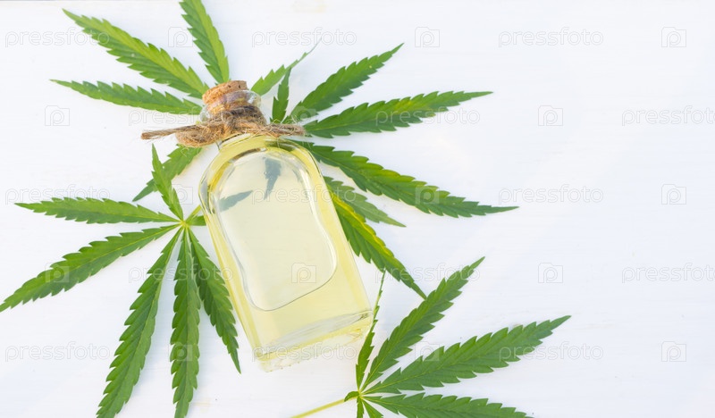 Конопляное масло и листья конопли. Изображение с выборочным фокусом