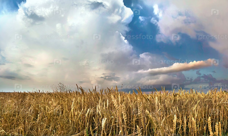 Панорама пшеничного поля на фоне облачного неба