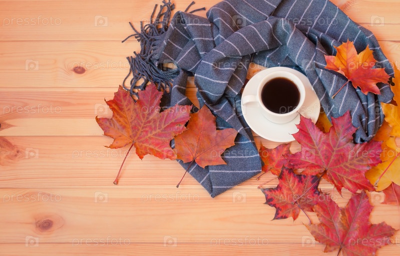 Кофе, шарф и осенние листья на дереве. Вид сверху