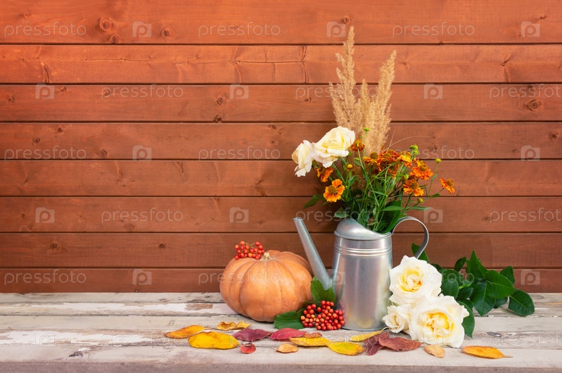 Букет белых роз, гелениум и сухая трава в лейке, тыква и белые розы рядом на состаренном деревянном столе