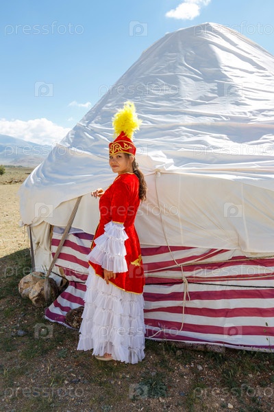 Молодая девушка казашка стоит у юрты