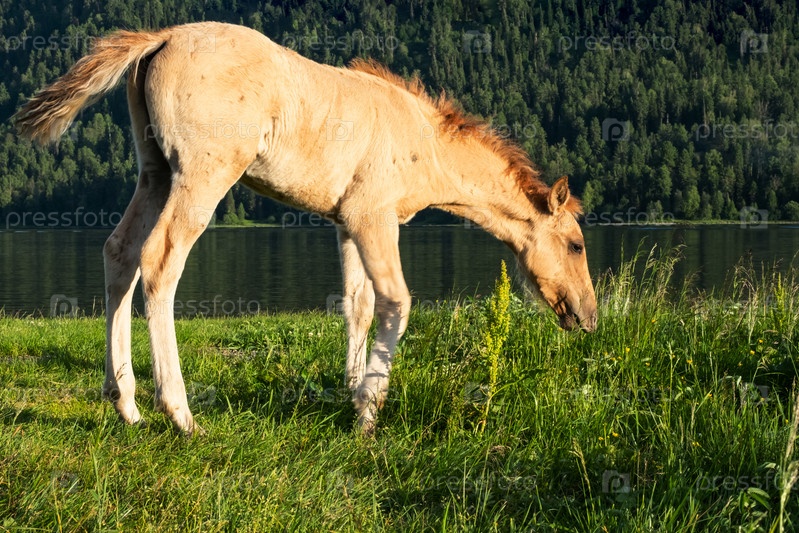 Милый жеребенок пасется на берегу озера. Молодая лошадь пасется на берегу озера