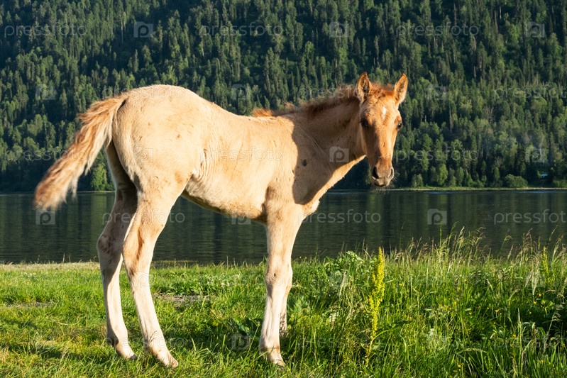 Милый жеребенок пасется на берегу озера. Молодая лошадь пасется на берегу озера