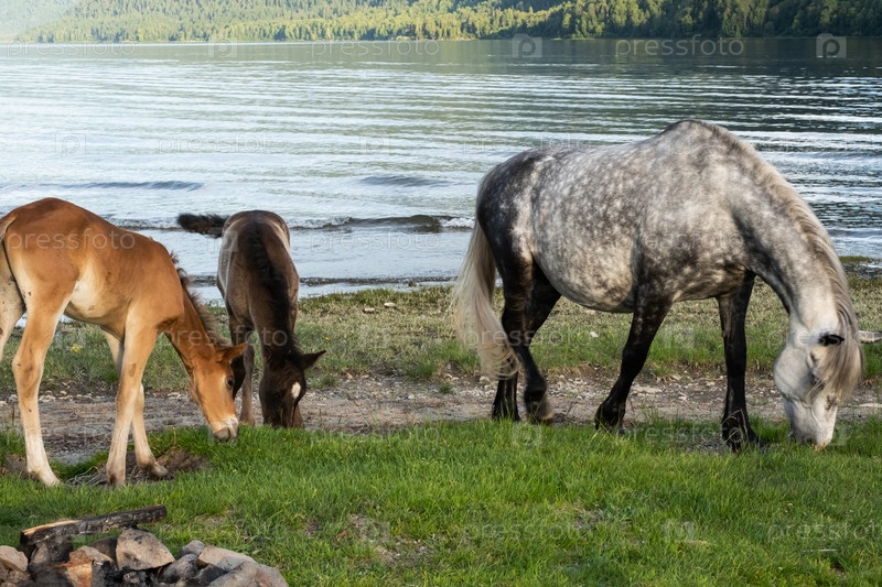 кобыла с жеребенком, пасущимся на берегу озера. Лошади пасутся на берегу озера