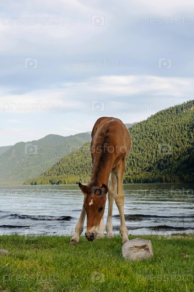 Милый жеребенок пасется на берегу озера. Молодая лошадь пасется на берегу озера