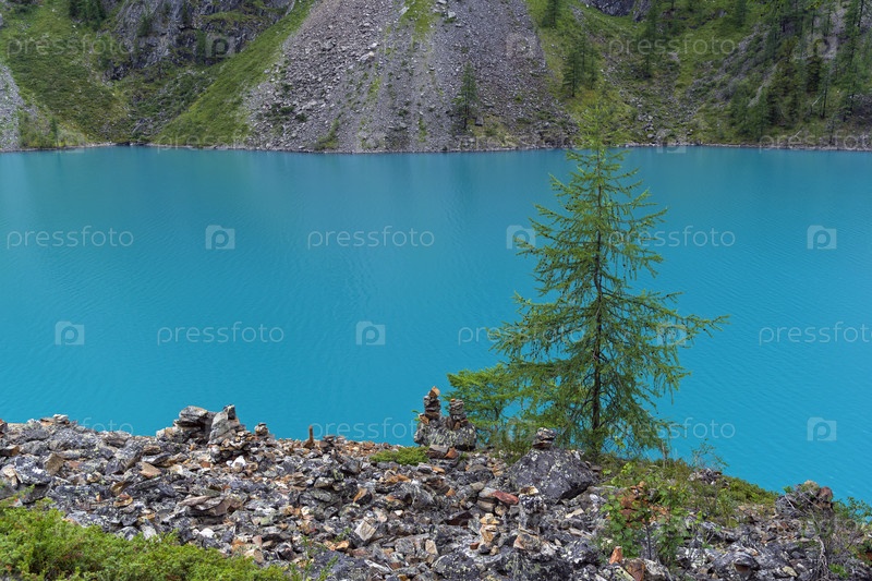 Пирамиды из камней, сложенные туристами на берегу Большого (нижнего) Шавлинского озера. Горный Алтай. Август