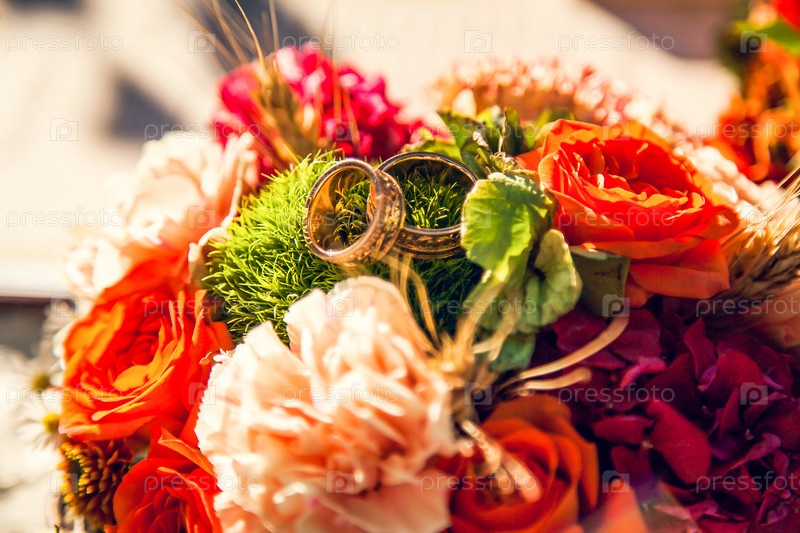 Обручальные кольца на букете невесты в осенней тематике