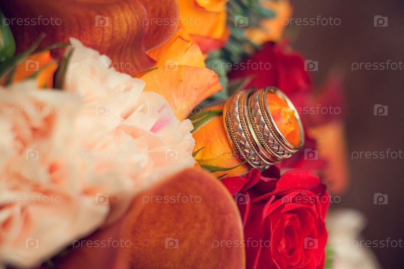 Обручальные кольца из золота разных цветов с плетеным дизайном и букетом невесты в зимнем или осеннем стиле крупным планом
