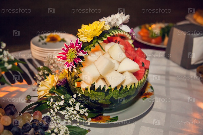 Резной арбуз, наполненный кусочками дыни и арбузной мякотью, украшенный живыми цветами