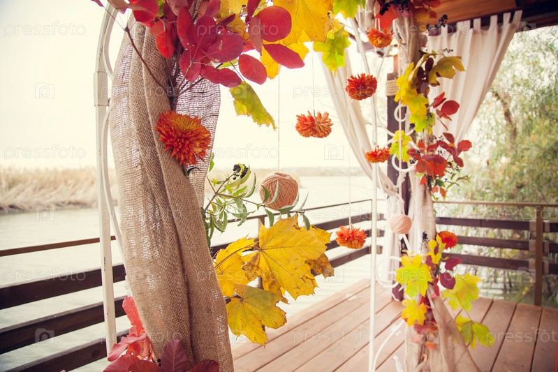 Осенний свадебный декор арки в деревенском стиле для свадебной церемонии на берегу реки