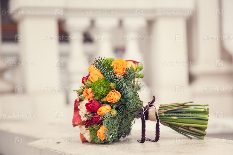 Свадебный букет невесты в зимнем или осеннем стиле с гвоздикой, розами, бутонами, елью, цветком каллы на размытом фоне