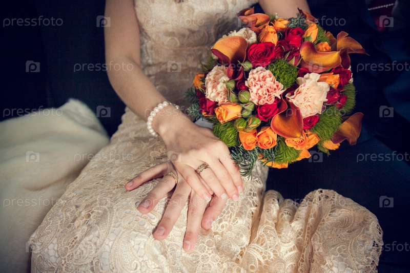 Руки жениха и невесты со свадебным букетом и кольцами на коленях невесты