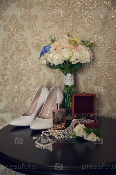 Детали свадьбы и подготовка: букет невесты, белые туфли, флакон духов, колье в шкатулке, бутоньерка жениха
