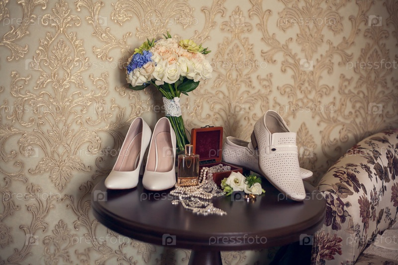 Детали свадьбы и подготовка: букет невесты, белые туфли, флакон духов, колье в шкатулке, бутоньерка жениха