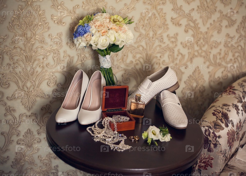 Детали свадьбы и подготовка: букет невесты, белые туфли, флакон духов, колье в шкатулке, бутоньерка жениха