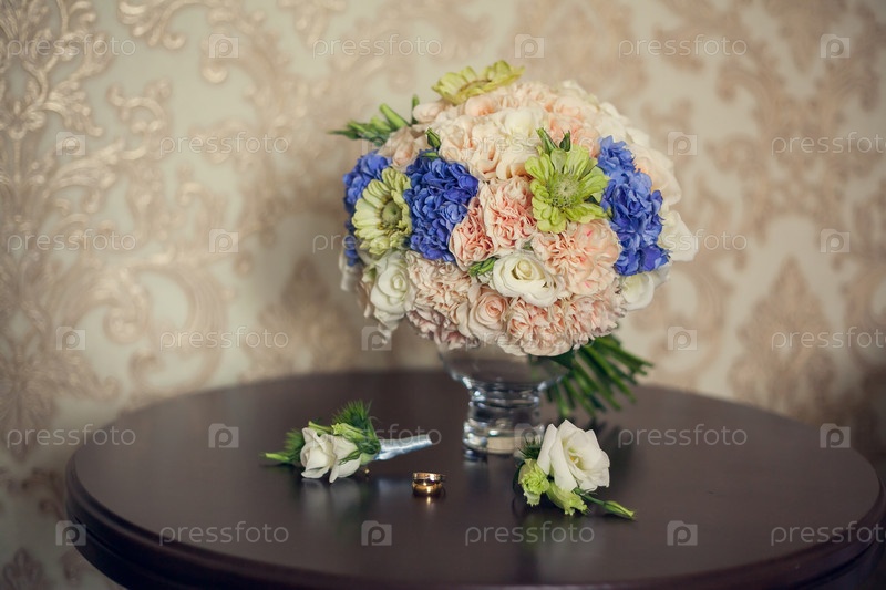 Букет невесты, обручальные кольца и бутоньерки на столе