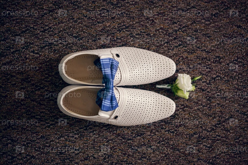 Белые туфли жениха, галстук-бабочка и бутоньерка, вид сверху. Утро жениха, детали свадьбы, подготовка к свадебной церемонии