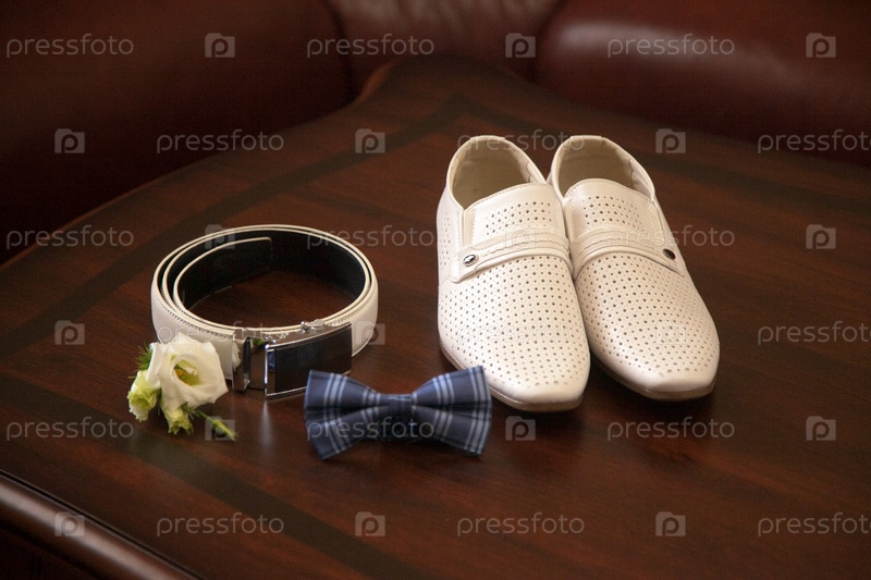 Белые туфли жениха, пояс, галстук-бабочка и бутоньерка, вид сверху. Утро жениха, детали свадьбы, подготовка к свадебной церемонии