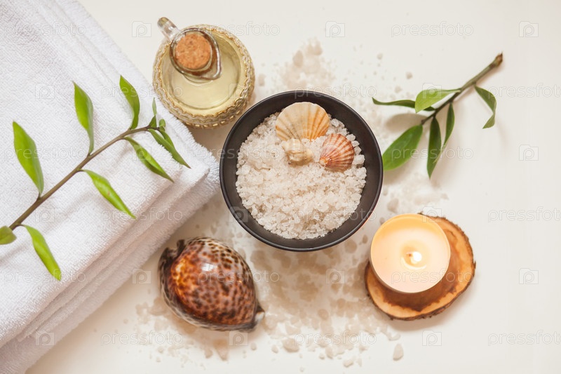 Спа, красота и велнес фон. Полотенце, косметическое массажное масло, лист, морская соль с ракушками и свеча