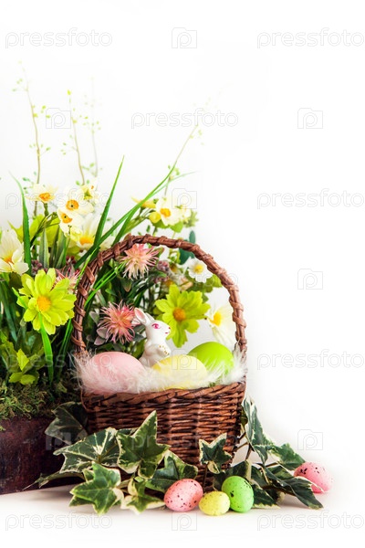 Счастливой Пасхи. Поздравительный пасхальный фон. Красочные пасхальные яйца и цветы с маленьким белым кроликом в корзине