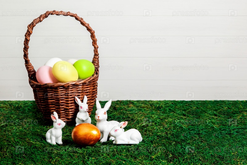 Счастливой Пасхи. Поздравительный пасхальный фон. Красочные пасхальные яйца в корзине с маленькими белыми кроликами вокруг золотого яйца на фоне мха и светлой деревянной стены с копией пространства