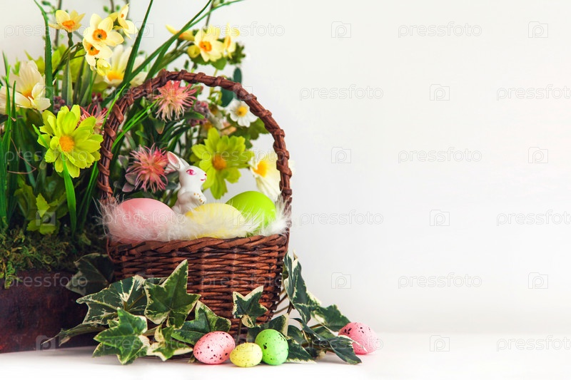 Счастливой Пасхи. Поздравительный пасхальный фон с копией пространства. Красочные пасхальные яйца и цветы с маленьким белым кроликом в корзине