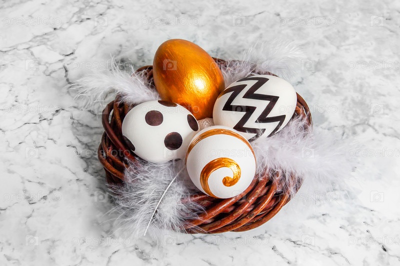 Счастливой Пасхи. Поздравительный пасхальный фон. Яйца окрашены в золотой и черный цвет в гнезде с белыми перьями на мраморном фоне