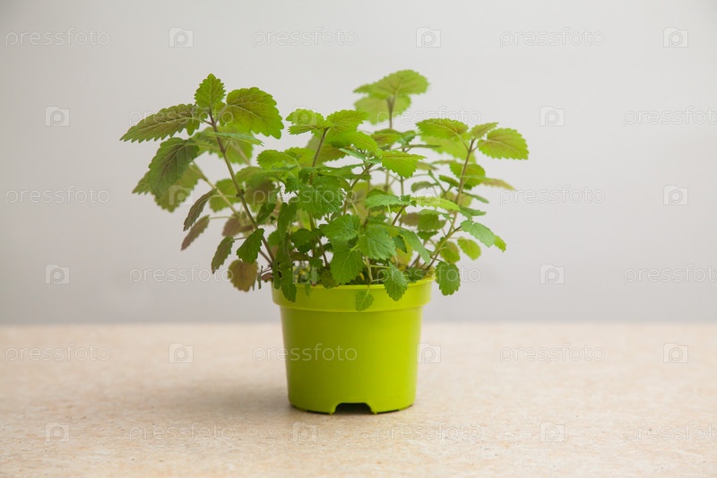 Лимонный бальзам. Мелисса, выращенная из семян в зеленом горшке