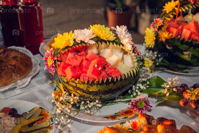 Резной арбуз, наполненный кусочками дыни и арбузной мякотью, украшенный живыми цветами