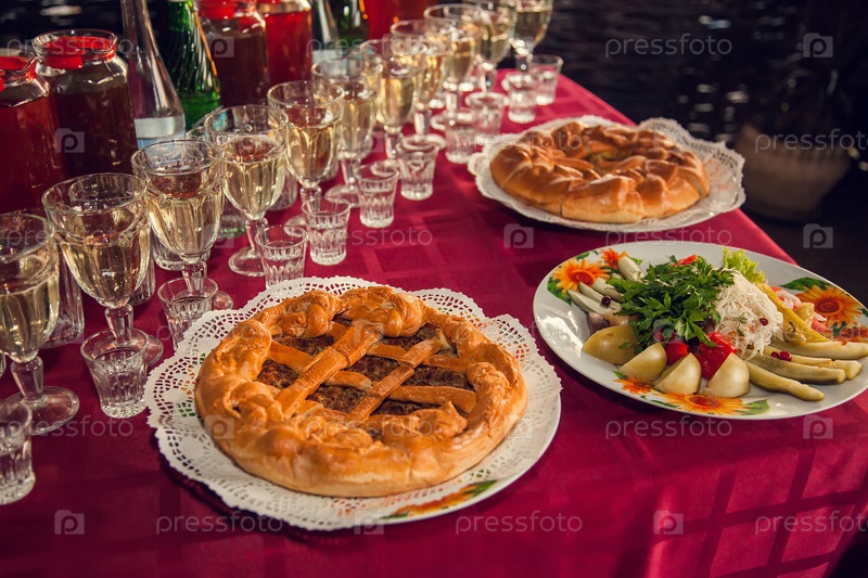 Русский праздник. Сервированный стол с русскими закусками: пирожки с начинкой, соленья, напитки налитые в стаканы