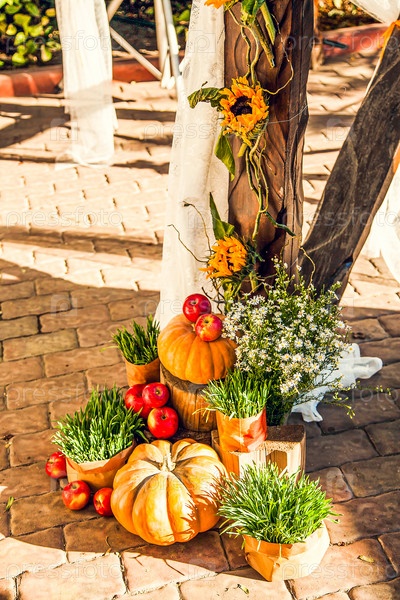 Свадебная арка для выездной свадебной церемонии, оформленная в осенней тематике тыквами