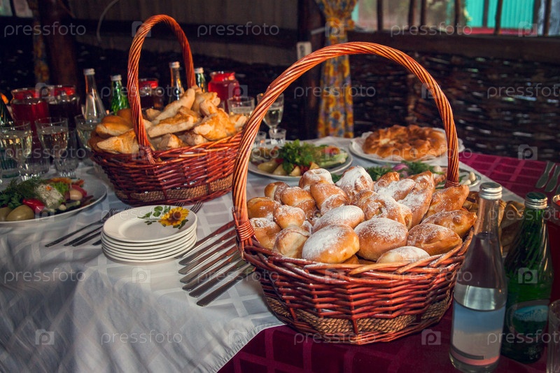 Русский праздник. Накрыт стол с русскими закусками: пироги с начинкой, пирожки в больших корзинах, соленья, напитки, разлитые по стаканам