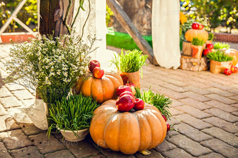 Свадебная арка для выездной свадебной церемонии, оформленная в осенней тематике тыквами